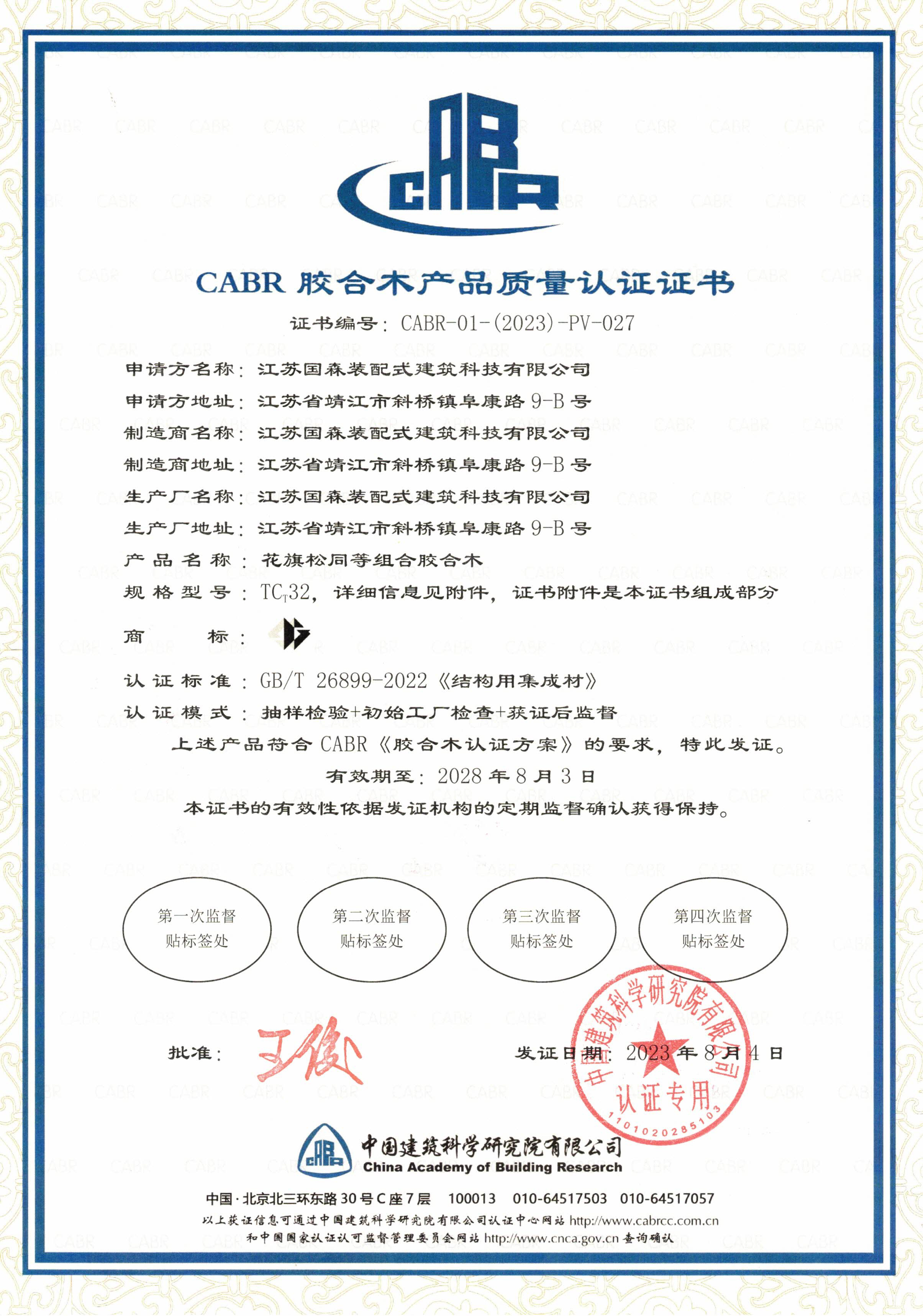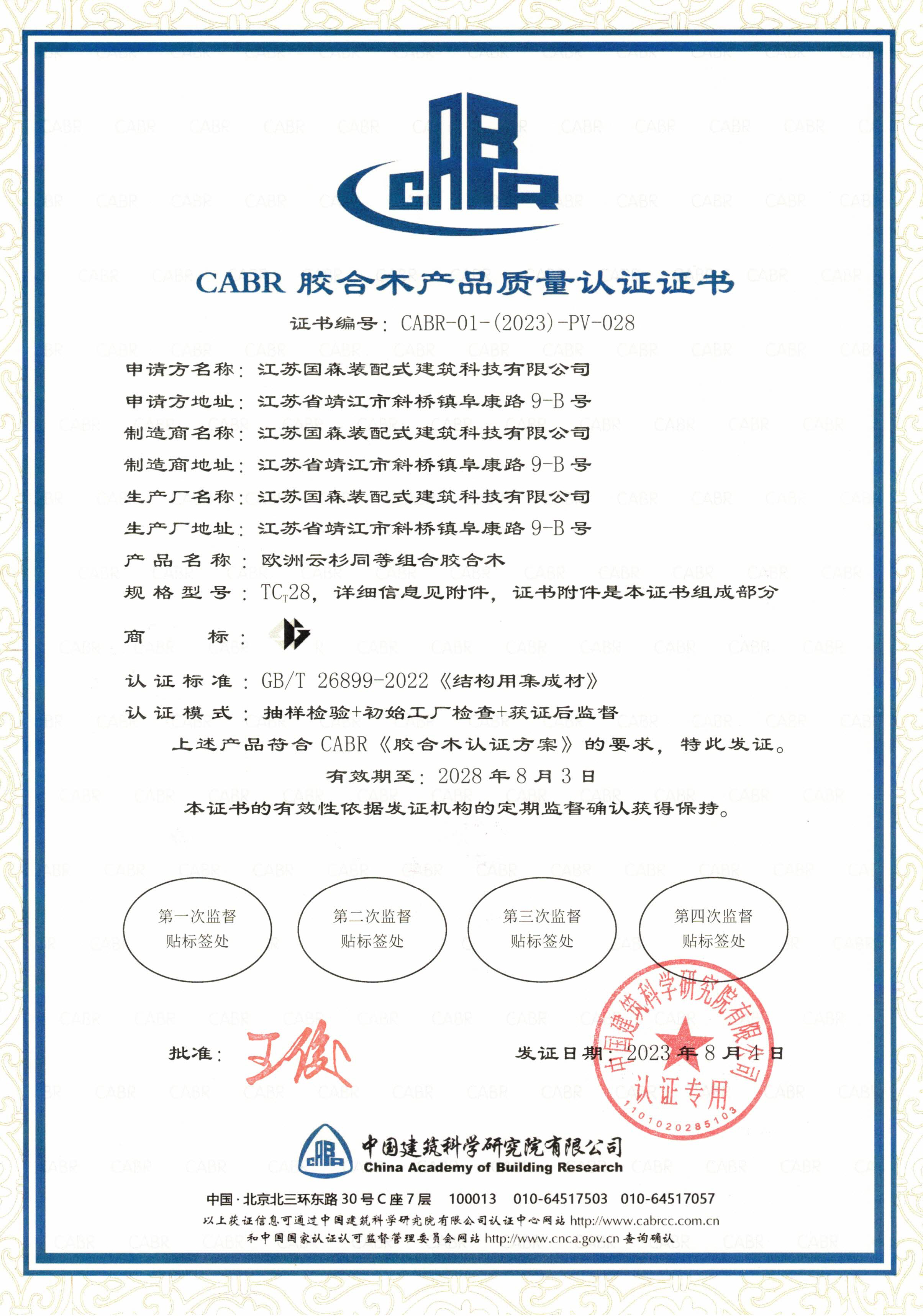 In recent years, the domestic glulam industry has developed rapidly, but the quality level is uneven. The validity of the CABR glulam product quality certification certificate is maintained through regular supervision by the Certification Center of the China Academy of Building Research. The quality inspection and testing of glulam products is completed by the Wood Industry Research Institute of the Chinese Academy of Forestry, which has stronger credibility and requires continuous compliance verification, factory assurance capacity supervision and inspection, product consistency supervision and inspection, and product supervision and inspection. The acquisition of this certification is the recognition of the quality of Guosen products by the authoritative organization, which fully reflects the credibility and reliability of Guosen products in the market, and further enhances the company's reputation and competitiveness in the market.